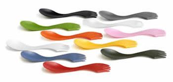 Im Gegensatz zu den sonst üblichen Sporks, die man in Outdoorläden findet, ist beim Exemplar von Light My Fire nicht Gabel und Löffel in einem Ende vereint, vielmehr hat man hier ein Ende mit Löffel und eins mit Gabel. Mit diesem Ansatz liegt er deutlich näher an "echten" Löffeln und Gabeln, vom Löffel fliesst nicht wegen der Zinkenausschnitte die Hälfte herunter und die Gabel ist lang genug, um auch widerspenstige Stücke aufzuspiessen. Zusätzlich befindet sich an einer Seite der Gabel eine Zahnung, um sie auch als Messer verwenden zu können - allerdings ist dieses Extra wohl nur angebracht worden, um den Spork als "alles drei in einem" bezeichnen zu können, wirklich etwas damit zu schneiden dürfte sich schwierig gestalten.Der Spork ist knapp 17 Zentimeter lang und wiegt wie bereit erwähnt knapp 10 Gramm. Er ist in vielen Farben erhältlich, hier eine Übersicht von der Herstellerseite: